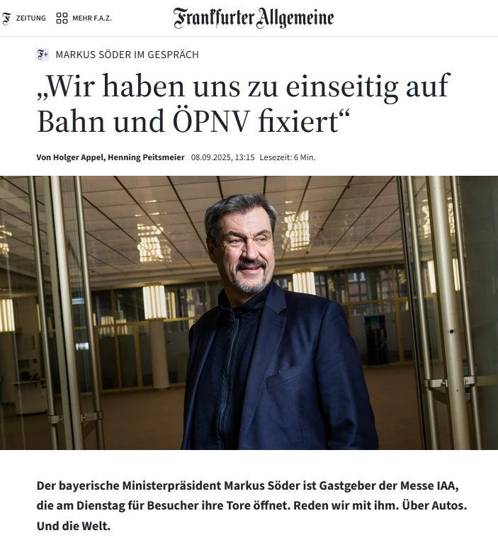 Markus Söder, ein Politiker, der gerne andere Leute vor den Kopf stößt, sagt in einem Interview der FAZ: "Wir haben uns in Deutschland zu einseitig auf die Bahn und den öffentlichen Personennahverkehr fixiert" (Screenshot des Titels). Er rechtfertigt zwar das viele Geld für die Münchner zweite S-Bahn-Stammstrecke (und leidet wohl eher nicht unter der dadurch verursachten massiven zeitlichen Verschiebung des S-Bahn-Ausbaus), stellt aber als besonders innovative Idee für München "überdachte Radwege auf Stelzen entlang der Straßen" heraus. Ein Ministerpräsident muss nicht unbedingt Ahnung von Verkehrslösungen haben; in Bayern droht aber immer, dass man ihm beim Wort nimmt. [el] |